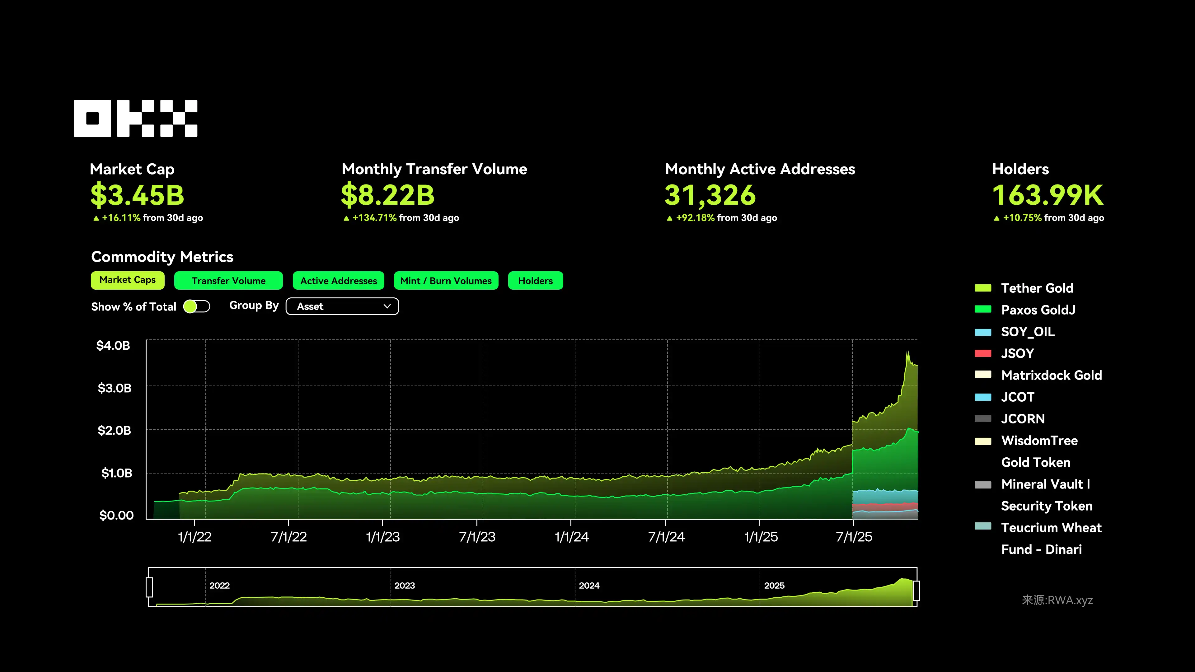 As of November 10, the current commodity tokens in the RWA sector have shown significant growth, with the total scale gradually increasing from less than $10 in the early days to about $3.5 billion, with a monthly trading volume of $8.22 billion, 31,326 monthly active addresses, and 164,000 holders. In particular, gold tokens have performed outstandingly, while tokenized assets for commodities like oil and soybeans have recently shown an accelerating upward trend, with overall market activity and scale rapidly expanding.