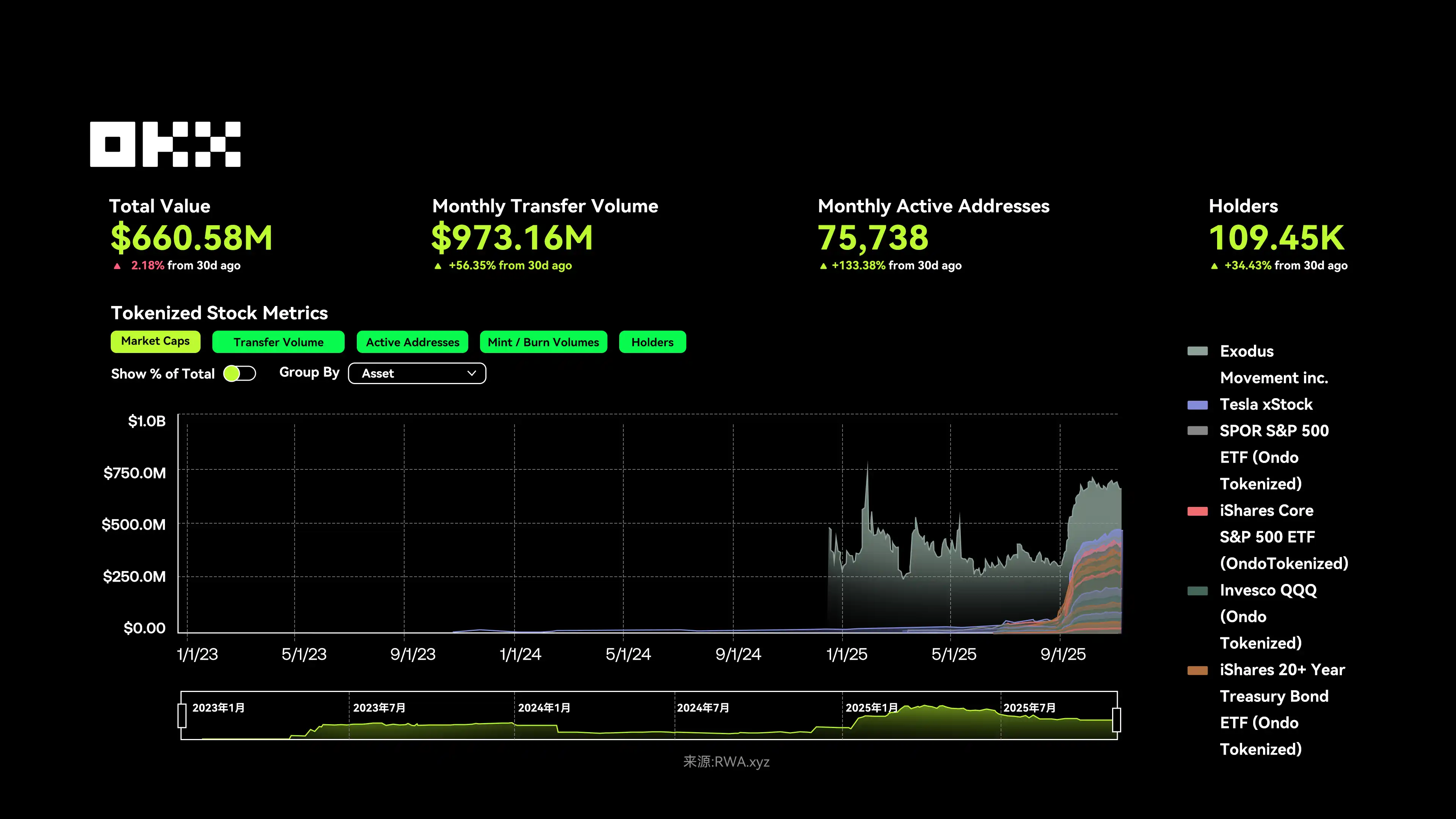 As of November 10, 2025, the total locked value of listed stocks is approximately $661 million, with a monthly trading volume of $973 million (month-on-month +56.35%), active addresses totaling 75,738 (month-on-month +133.38%), and the total number of holders surpassing 109,000 (month-on-month +34.43%). Overall, user participation and trading enthusiasm are continuously rebounding, indicating that the market is entering a new growth cycle.