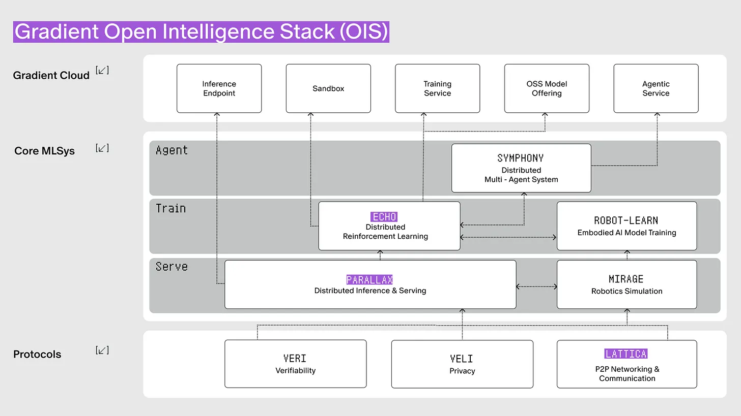 Gradient solves this problem with three core technologies. Lattica establishes a communication network in a distributed environment. Parallax handles inference within this network. Echo trains models through reinforcement learning. These three technologies are organically connected, forming the open intelligence stack.