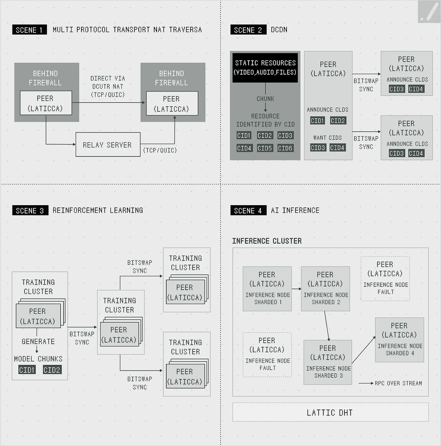 Lattica achieves stable and efficient data exchange in distributed environments. The protocol supports AI training and inference, as well as applications like distributed video streaming. Lattica's demo showcases how it works.