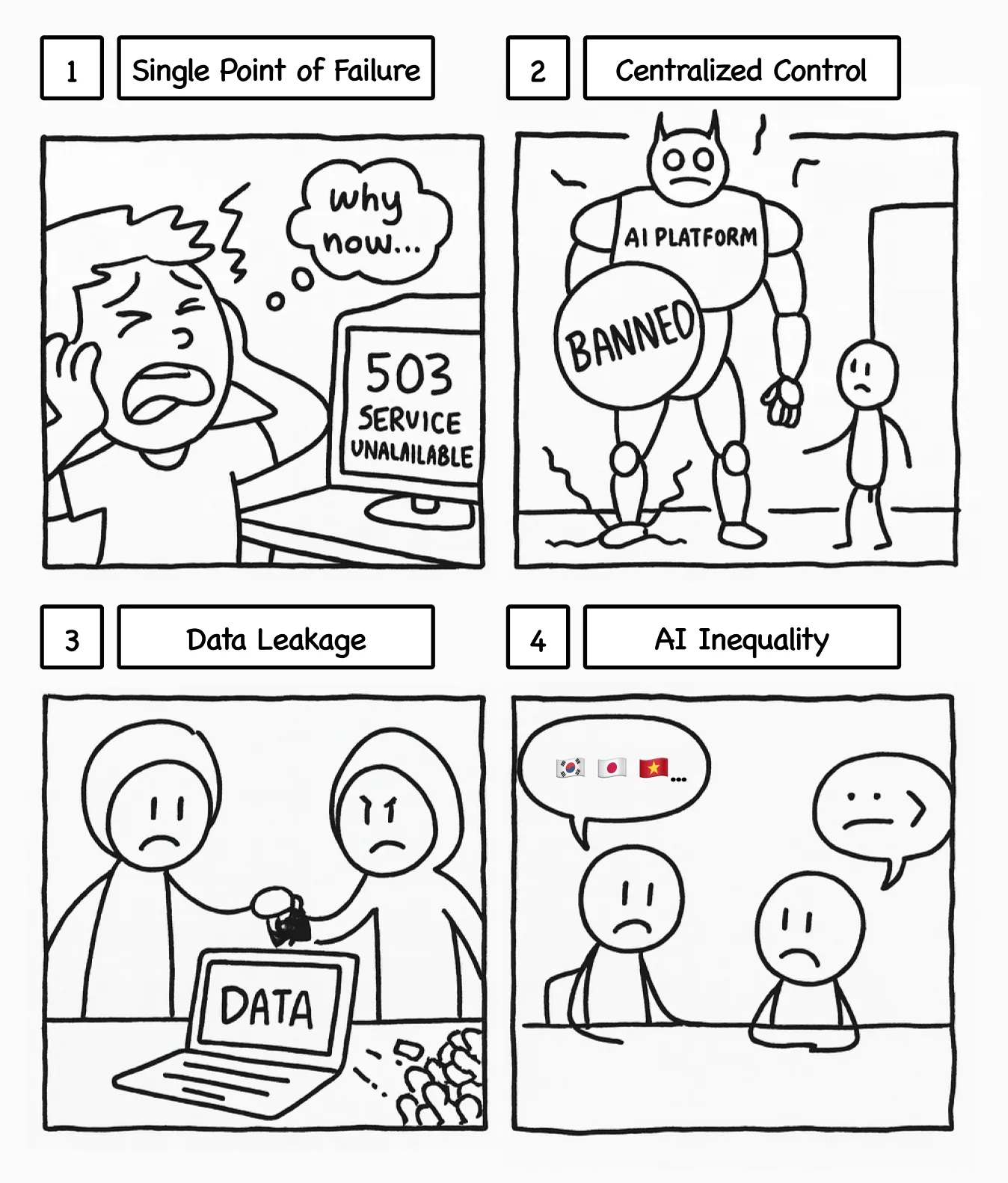 Training GPT-4 alone is estimated to have cost over $40 million and required tens of thousands of GPUs running for months. Inference also requires high-performance GPUs to generate each response. These high-cost barriers force the AI industry to consolidate around capital-rich large tech companies.