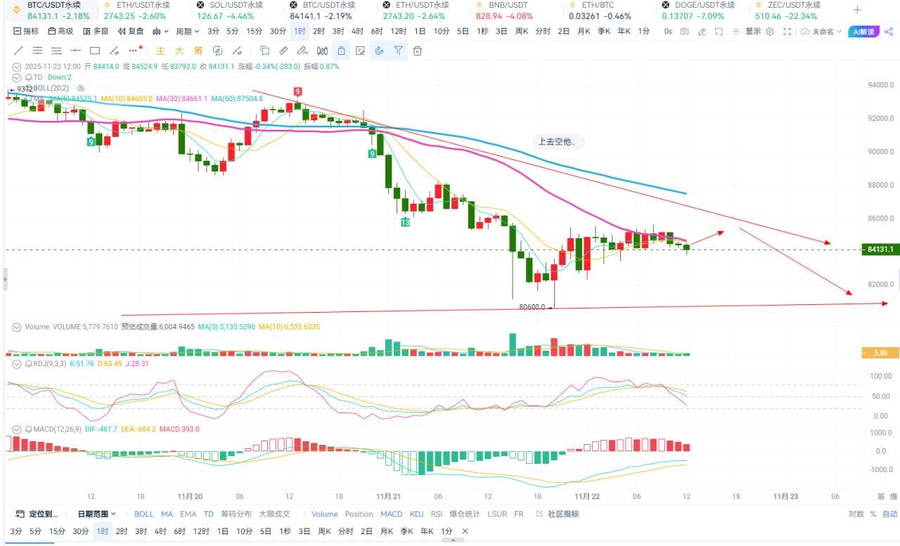 Yesterday, the market's panic selling sentiment led Bitcoin to drop again to the 80600 level, after which it began a rebound from an oversold condition. Currently, after the daily update, the TD indicator continues to lag, with all indicators maintaining a downward divergence, and the K-line shows a one-sided oscillation and decline. The continuous downward pressure from the MA moving averages has also led to the current rebound being suppressed. The key resistance for Bitcoin is referenced at: 85500-87000. Due to the continuous decline in high points, the short-term price rebound cannot effectively stabilize, so we maintain a focus on high shorts.