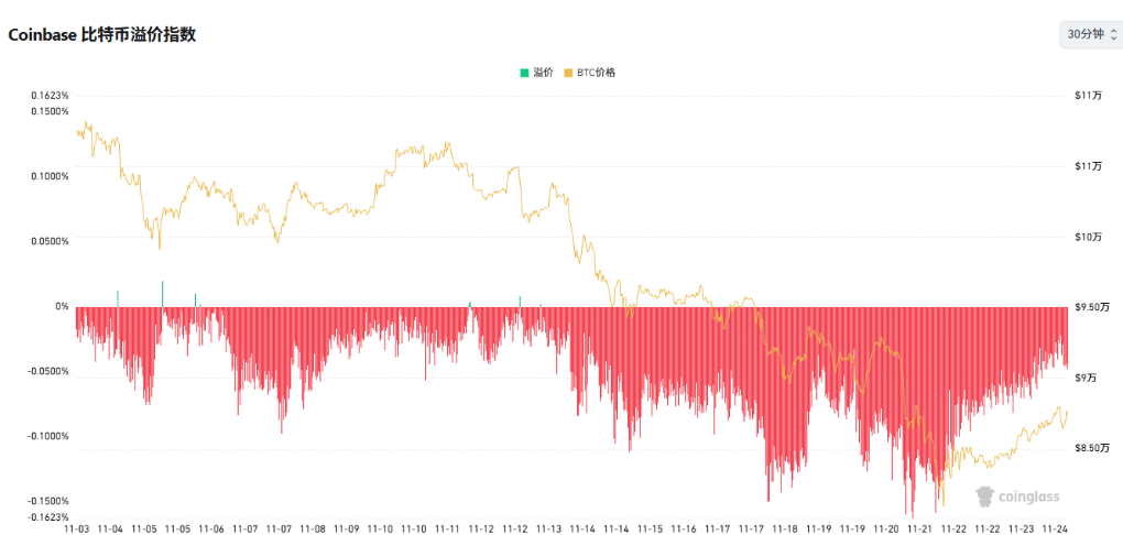 ● As a core barometer for observing U.S. institutional fund flows, the Coinbase Bitcoin Premium Index has remained in negative territory for 24 consecutive trading days since October 31. This is the first occurrence this year.