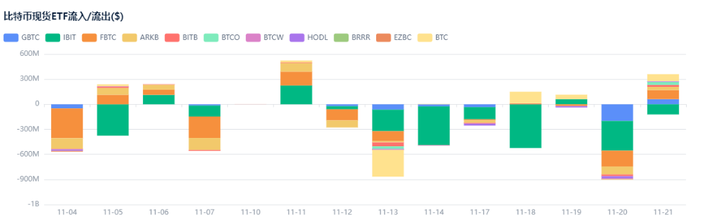 ● U.S. Bitcoin spot ETFs are undergoing the most severe test since their approval for listing in January. As of November 21, the total net outflow from all Bitcoin ETFs in November has reached $3.79 billion, breaking the previous record of $3.56 billion set in February.