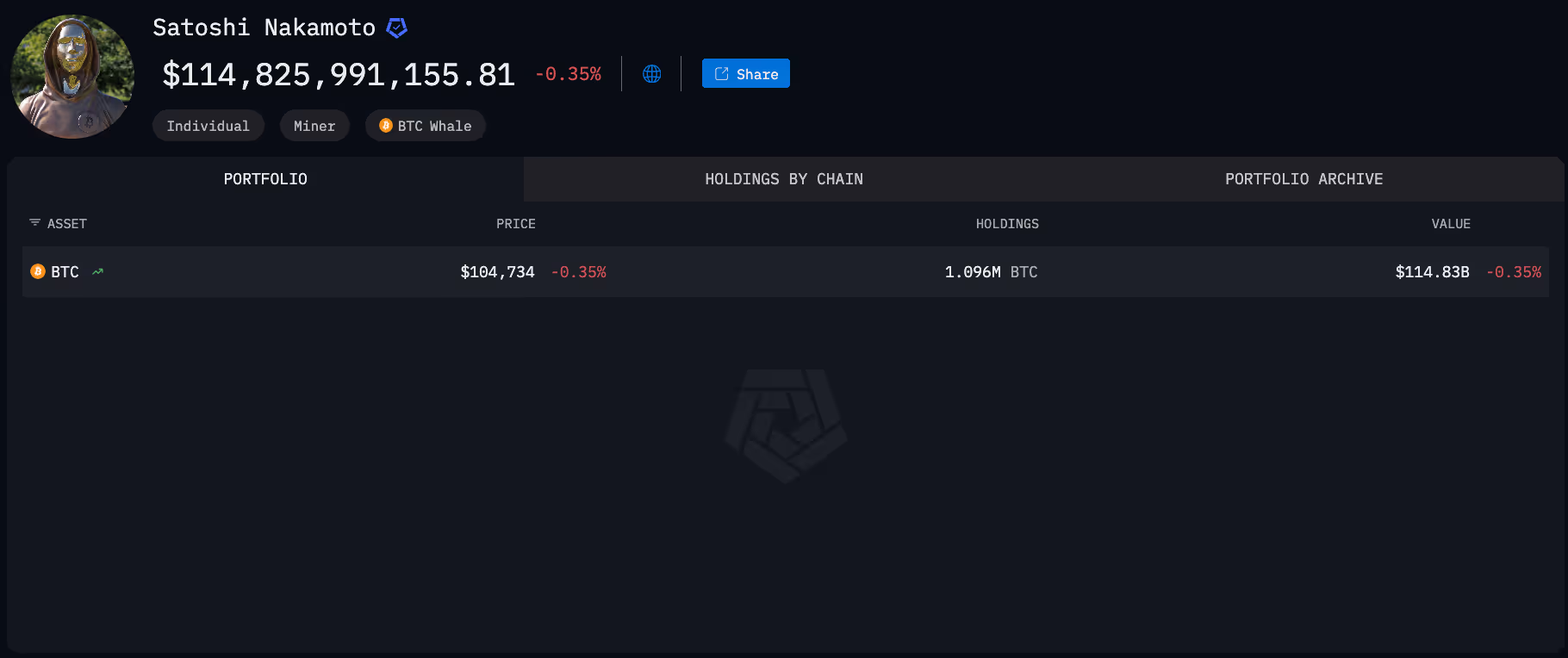 Below is a list of the wealthiest individuals on-chain globally, organized based on Arkham data, starting with Nakamoto's immense wealth and gradually listing holders from billions to millions of dollars.