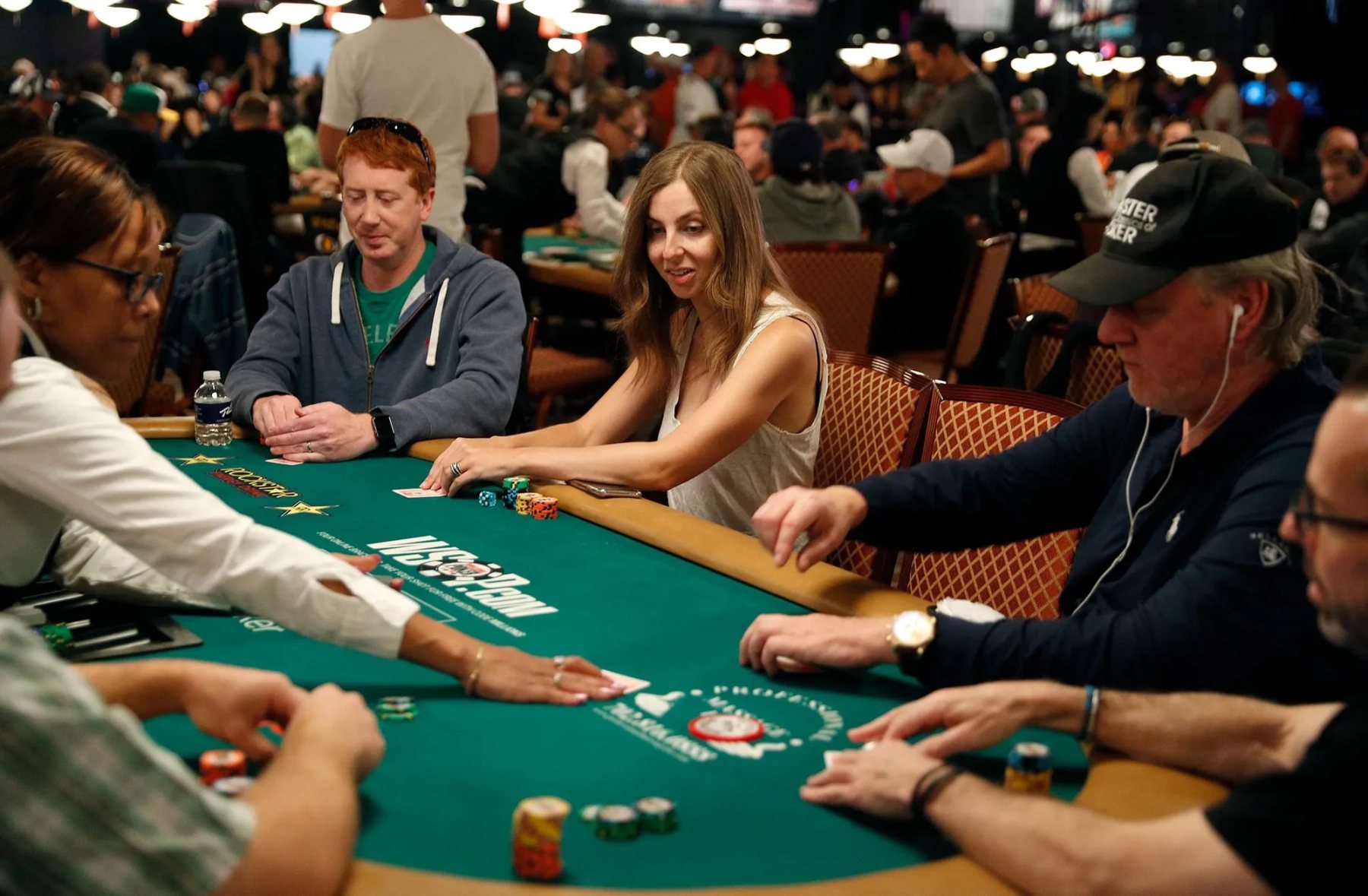 (Konnikova (center) at the 2018 World Series of Poker in Las Vegas. Photographer: John Locher / AP)