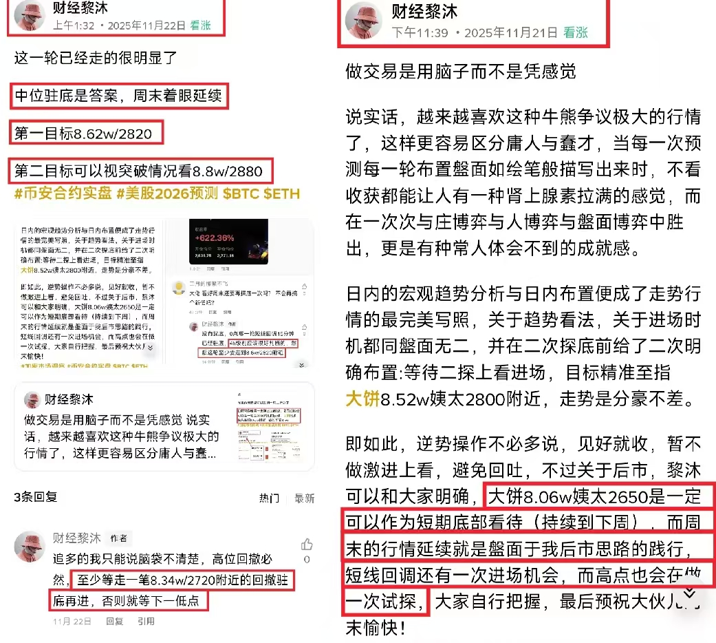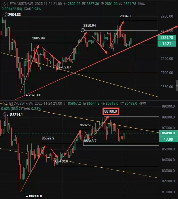 Hello everyone, this is the Limu Channel. Today is Monday. Due to some matters, this article is coming a bit late, but it does not affect our mid-term perspective given last week's drop of Bitcoin to 80,600 and Ethereum to 2,620. Over the weekend, we added two target points for the upward movement, which are Bitcoin at 86,200 and Ethereum at 2,820, as well as Bitcoin at 88,000 and Ethereum at 2,880. The market has moved exactly as predicted.