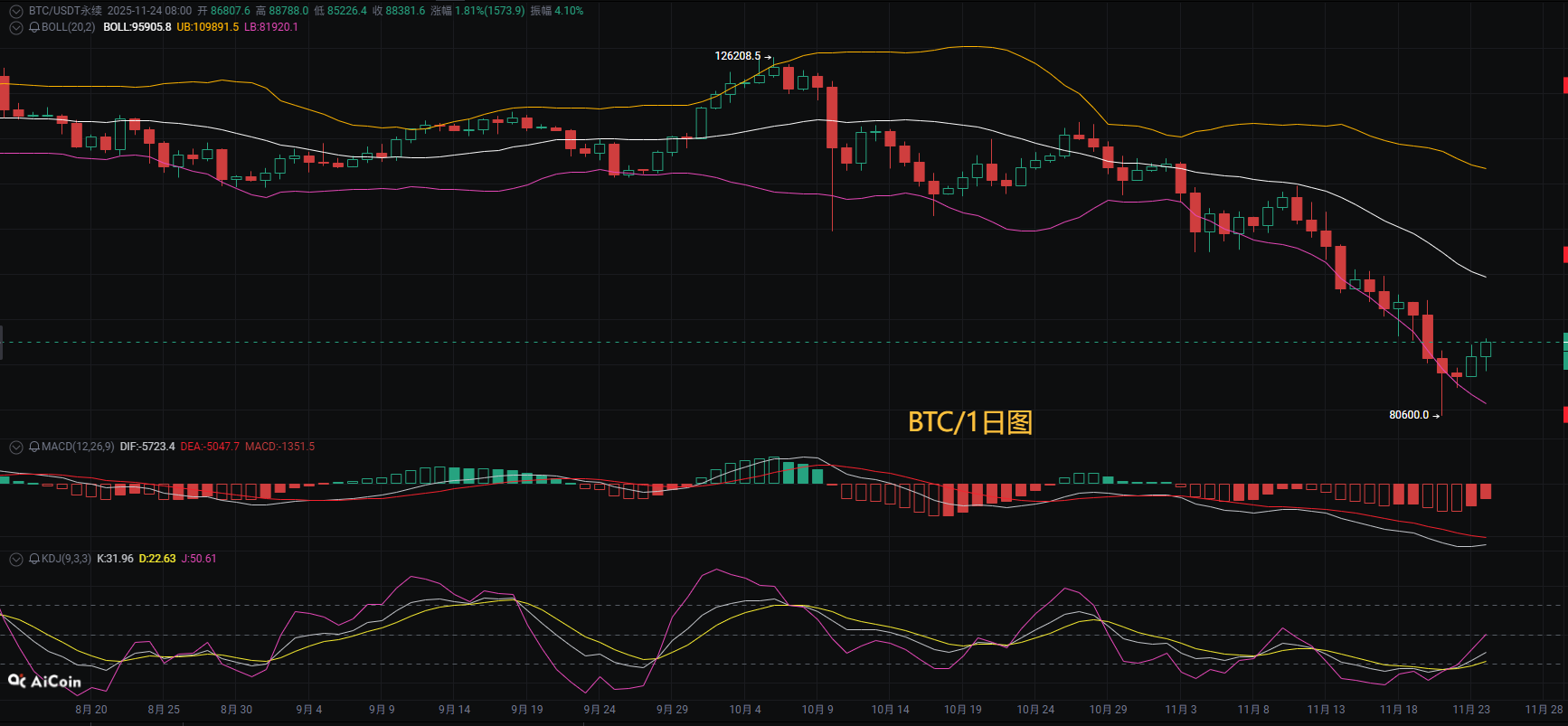 The daily chart shows a continuous rebound pattern for three days. On November 21, a single needle bottom was formed, stabilizing above 85,272 to create a short-term bottom structure. On November 24, a bullish candle broke the previous day's high of 88,127, but after touching 88,834, it fell back to 88,520, indicating significant selling pressure near the 89,000 round number.