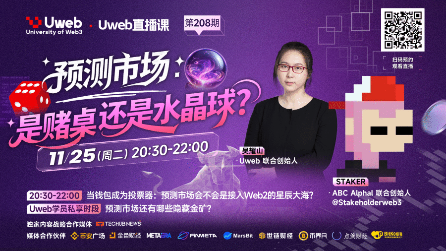 With the successful election of Donald Trump as President of the United States, the prediction market has completely emerged. During the 2024 election, the betting amount on the Polymarket platform exceeded $2 billion, with a total market size reaching $3.7 billion, making "voting with real money" the most accurate thermometer of public opinion globally. On the evening of November 25, Uweb's 208th live session invited STAKER, co-founder of ABC Alpha, to deeply analyze this sector with teacher Wu Yaoshan: Is it a casino dressed in blockchain, or the sharpest information aggregation tool of the next decade?