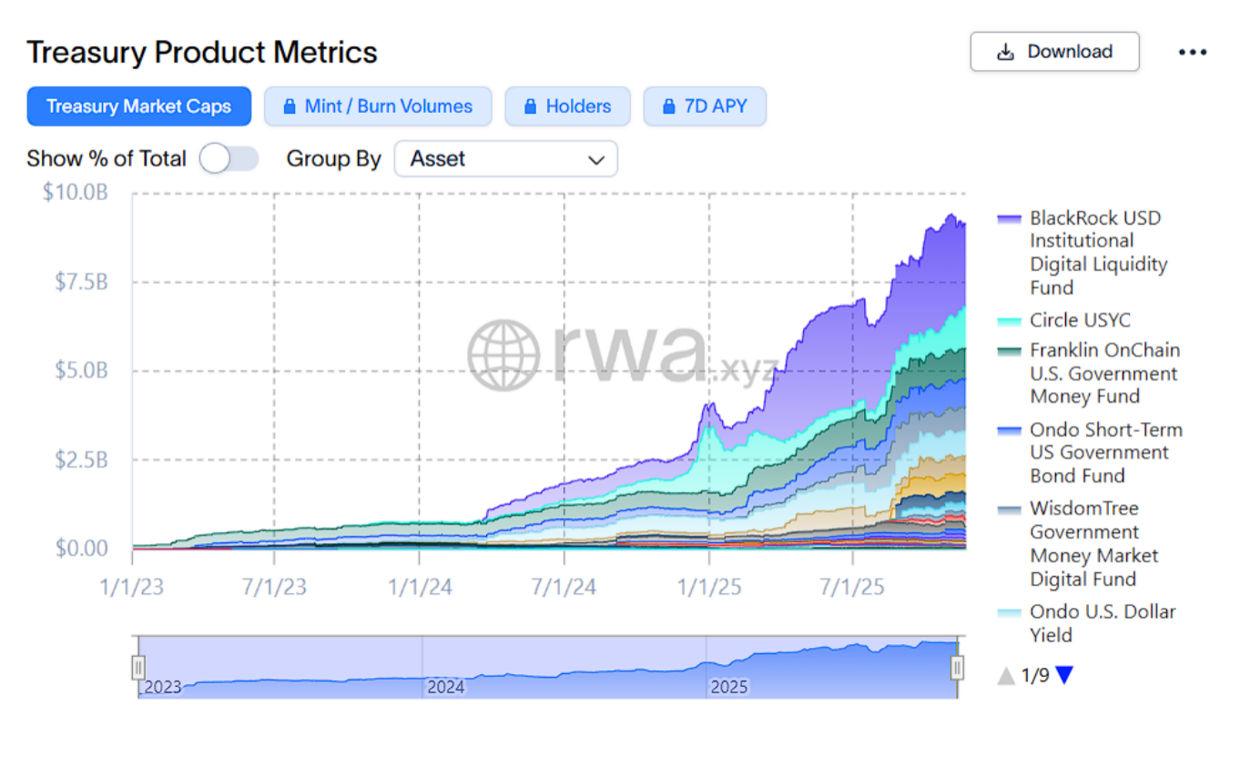 According to market size charts published by RWA.xyz, tokenized treasuries have grown from less than $500 million at the beginning of 2023 to several billion dollars by 2024, approaching the $10 billion level by 2025, driven by multiple institutions including BlackRock, Franklin, Securitize, and Ondo. This growth does not indicate that traditional assets are migrating on-chain but rather shows that crypto users' interest in obtaining off-chain yield structures on-chain is increasing, and cross-asset allocation is extending from platform interfaces to the on-chain layer.