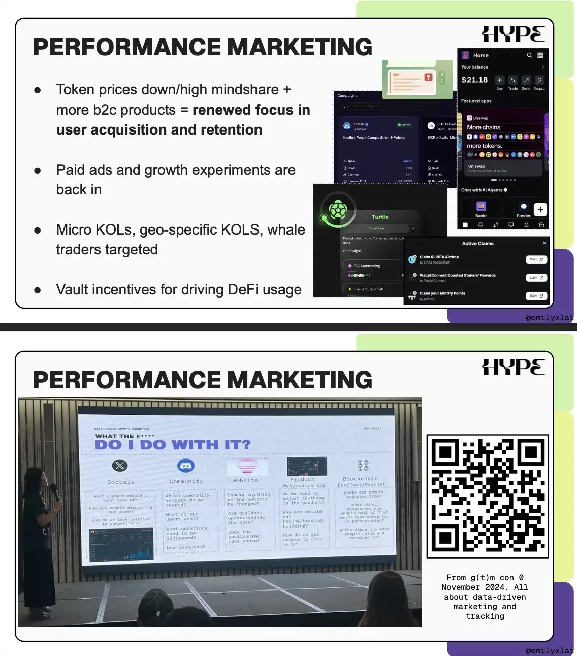 Performance marketing is making a comeback, driven by the industry's renewed focus on user acquisition and retention. This means: installing tracking tools (on-chain, product/web, distribution channels); growth experiments; a combination of paid and organic traffic; evolving from social tasks to liquidity tasks; and precise KOL marketing campaigns.