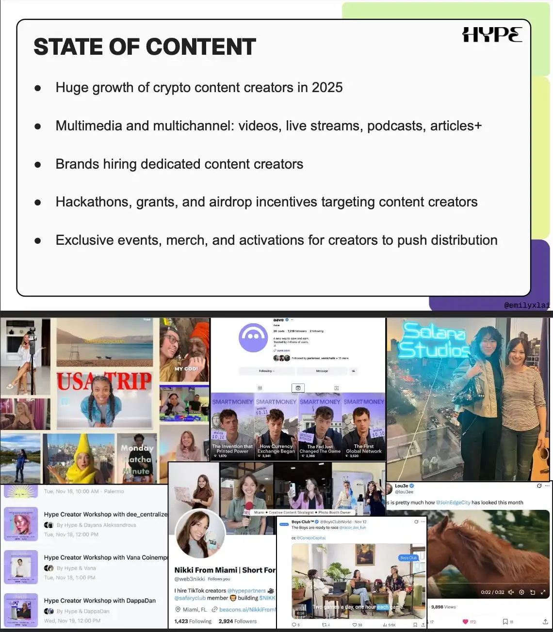 At Hype (@hypepartners), we hosted four content creator workshops during DevConnect week and introduced @web3nikki to lead a new short video department in January this year. Content will continue to saturate, and quality, depth, and production levels will become increasingly important, while reaching new users beyond CT is equally crucial.