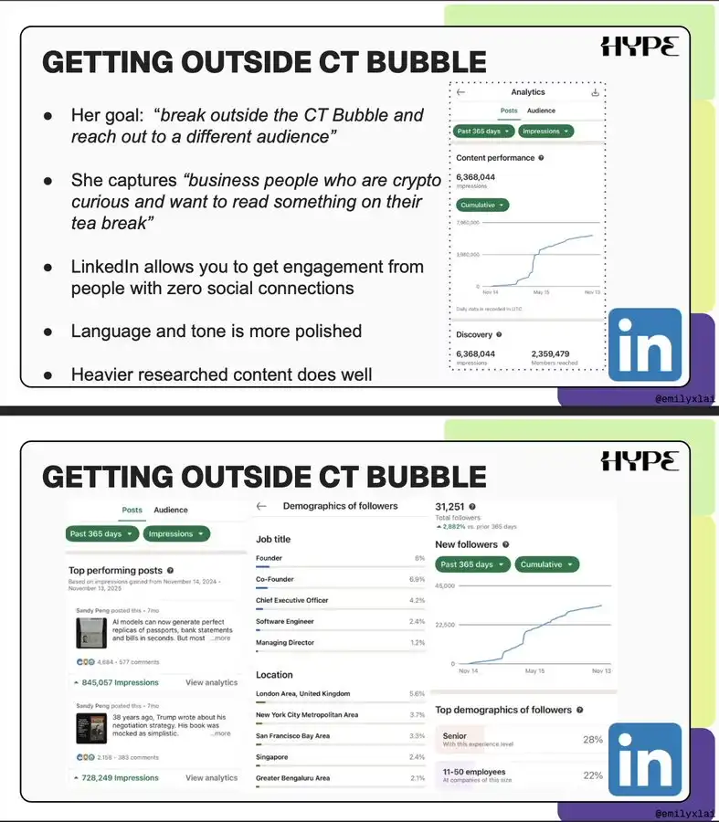 Take @Scroll_ZKP co-founder @sandypeng as an example: for someone who doesn't often use LinkedIn, she consistently posted throughout 2025, growing from zero to 6.3 million impressions and 31,000 followers, sharing her strategies and data (first time publicly, thanks Sandy).