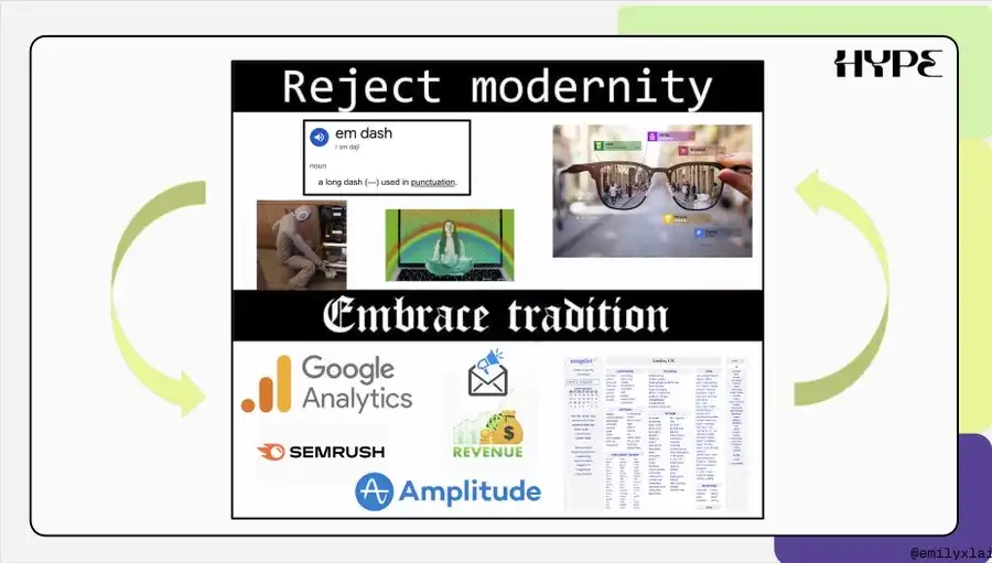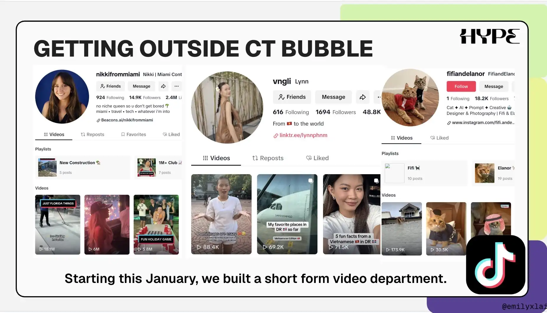 This year at Hype, we explored (and re-explored) new channels, including YouTube, Reddit, AI SEO (like Perplexity, GPT), Instagram, and Whop. In my presentation, I highlighted LinkedIn and TikTok.