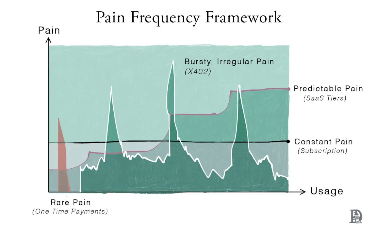 The upper right corner is the core of the modern internet, encompassing LLM queries, agent operations, serverless burst traffic, API calls, cross-chain transactions, batch jobs, and IoT device communication. Usage is both stable and volatile. Fixed charging models lower the psychological barrier to payment but fail to accurately reflect this reality. Light users pay too much, while heavy users enjoy subsidies, leading to a disconnect between revenue and actual usage.
