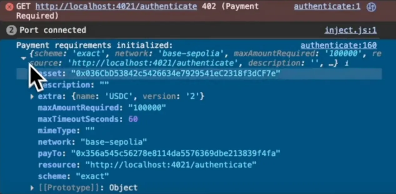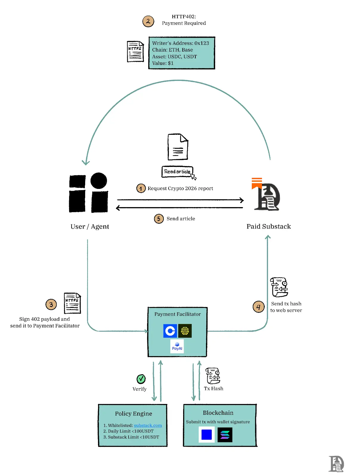 Imagine Substack charging $0.50 for a high-quality article. When you click the "pay to read" button, Substack returns a 402 code containing the price, accepted assets (like USDC), network (like Base or Solana), and policies. The content would look something like this: