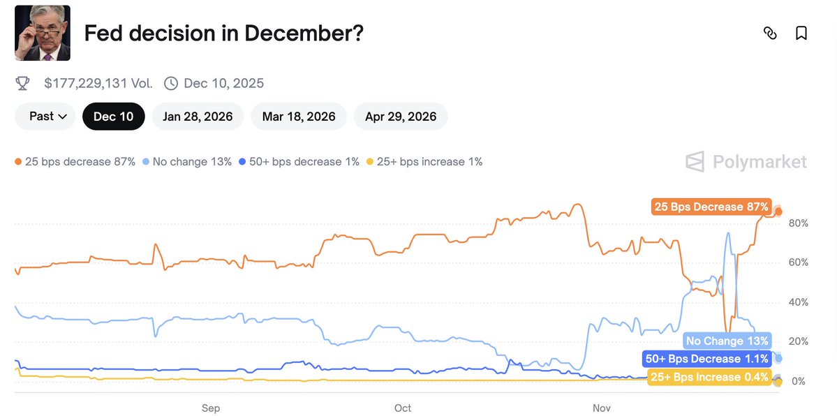 2️⃣ The probability of an interest rate cut on December 10 has significantly increased. Currently, the probability of a 25 basis point cut in December on Polymarket has risen to 87%, and the market will start to speculate on the potential benefits of the rate cut.
