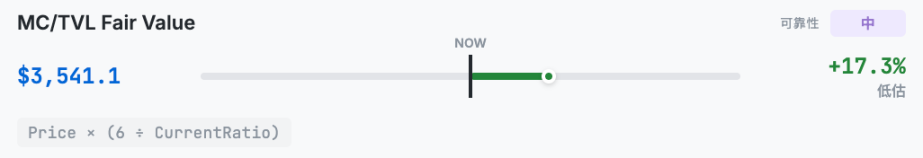 This model is essentially a mean-reversion model, calculating by assuming the historical average market cap to TVL ratio is 6 times. If it exceeds this, it is considered overvalued; if not, it is undervalued. The formula is Price × (6 ÷ Current Ratio), resulting in a price of $3,541.1, indicating a 17.3% upside from the current price.