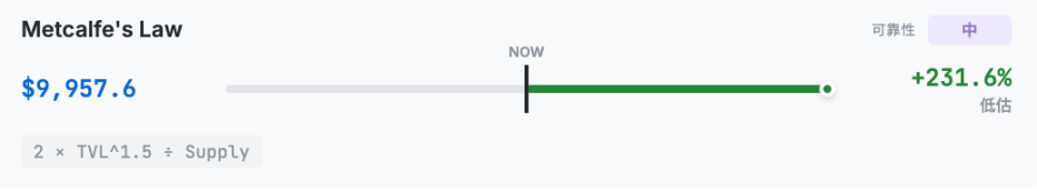 Hashed states that this model has been empirically validated by academic researchers (Alabi 2017, Peterson 2018) for Bitcoin and Ethereum. Here, TVL is used as a proxy indicator of network activity. The calculation formula is 2 × (TVL/1B)^1.5 × 1B ÷ Supply, resulting in a price of $9,957.6, indicating a 231.6% upside from the current price.