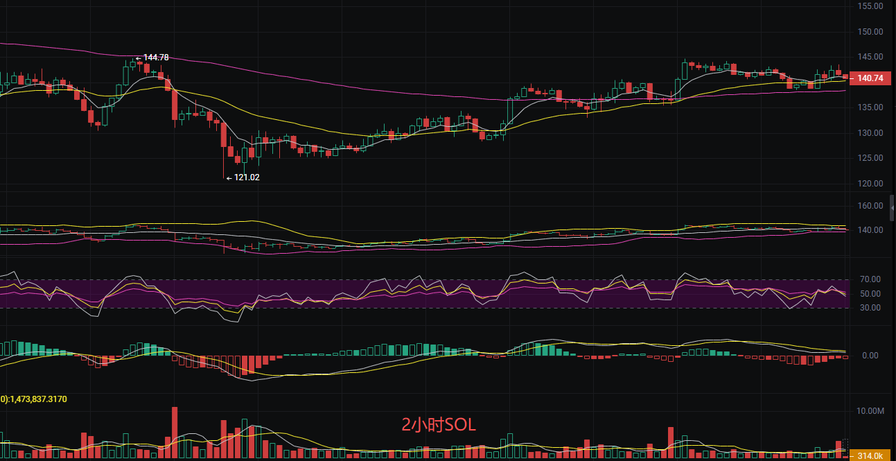 The current price of Solana is 140.7. Liying assesses that Solana is currently in a consolidation pattern, fluctuating between a strong resistance level at 144.7 and a strong support level at 138. A bullish engulfing pattern has appeared on the technical front, suggesting potential reversal signs in the market. However, the entangled moving averages, weakened momentum, and insufficient trading volume indicate limited ability to break through resistance. In the short term, the price is more likely to oscillate near the resistance level, and attention should be paid to whether an effective breakout can occur. The daily chart shows consolidation between 138 and 144. A short-term support has formed on the 2-hour chart, with MACD showing weakened momentum, and the daily trend is slightly bearish but with signs of recovery. The EMA is in a bullish arrangement, and the short-term moving averages provide support. The market remains in a consolidation phase, with a slow upward process. When entering the market, it is important to pay attention to changes in pressure and support.