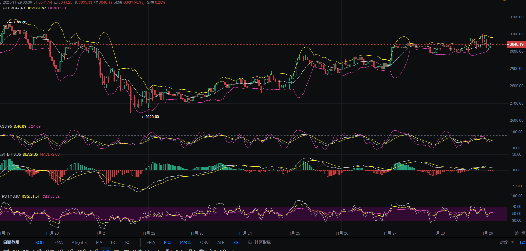 The 1-hour Bollinger Bands for Ethereum are trending downwards. The evening candlestick failed to break through 3100, resulting in a pullback. The MACD has successfully expanded below the 0 axis, with the fast and slow lines converging twice to form a death cross. The KDJ lines are approaching oversold territory, and the RSI lines show potential for an upward double test of previous highs.