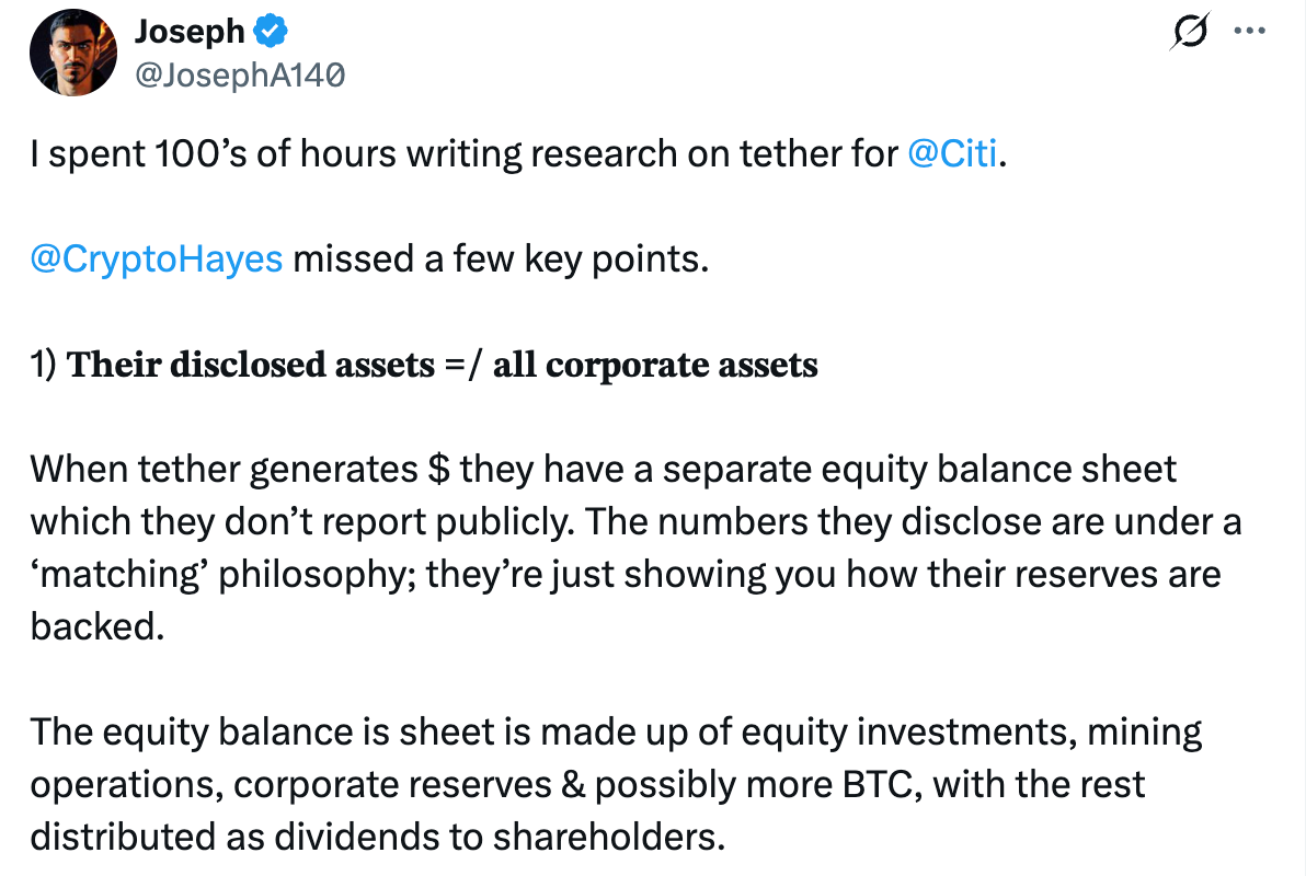 Joseph, former head of cryptocurrency research at Citigroup, also mentioned regarding the second point that the assets disclosed by Tether do not equal all the assets they hold—when Tether generates profits, they will have a separate equity asset balance sheet, which will not be publicly disclosed along with the reserve status; Tether is highly profitable, and its equity value is very high, allowing them to cover any gaps on the balance sheet by selling equity; Tether will not go bankrupt; on the contrary, they have a money printing machine.