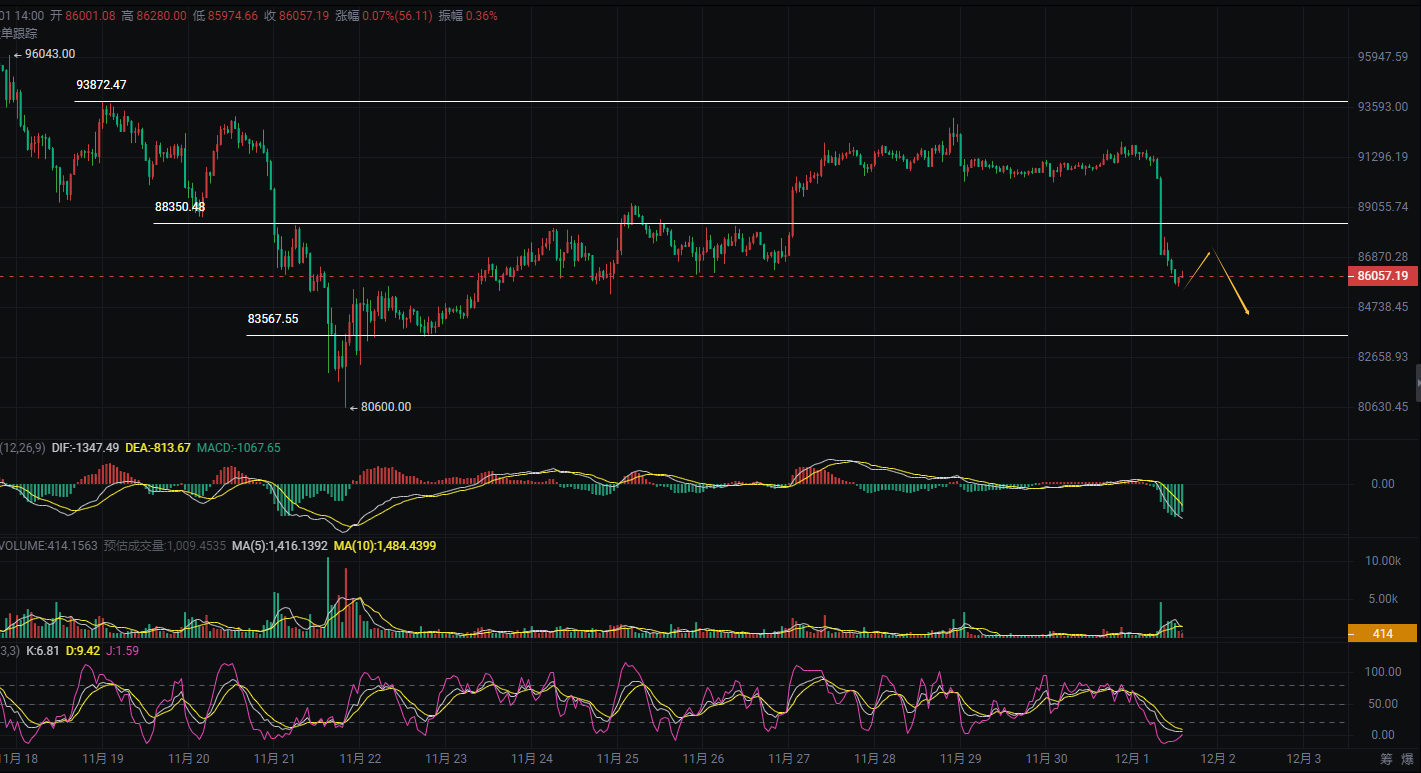 After a slight rebound at the end of November, the cryptocurrency prices experienced a waterfall-like crash again this morning. Multiple factors are driving this, including uncertainties from the Federal Reserve and recent official announcements in China aimed at suppressing the crypto market, which have triggered a chain reaction. Additionally, large capital outflows from institutions and technical corrections are also reasons for this significant drop. Therefore, caution is required during this new downturn, paying attention to whether the previous low support can hold. If it breaks down, we can look for new lows; if it holds, there may be a short-term rebound. If there is another rebound, it could be seen as a buying opportunity in a small bull market.