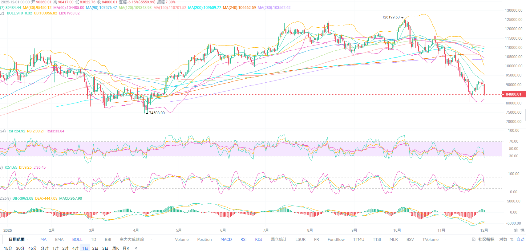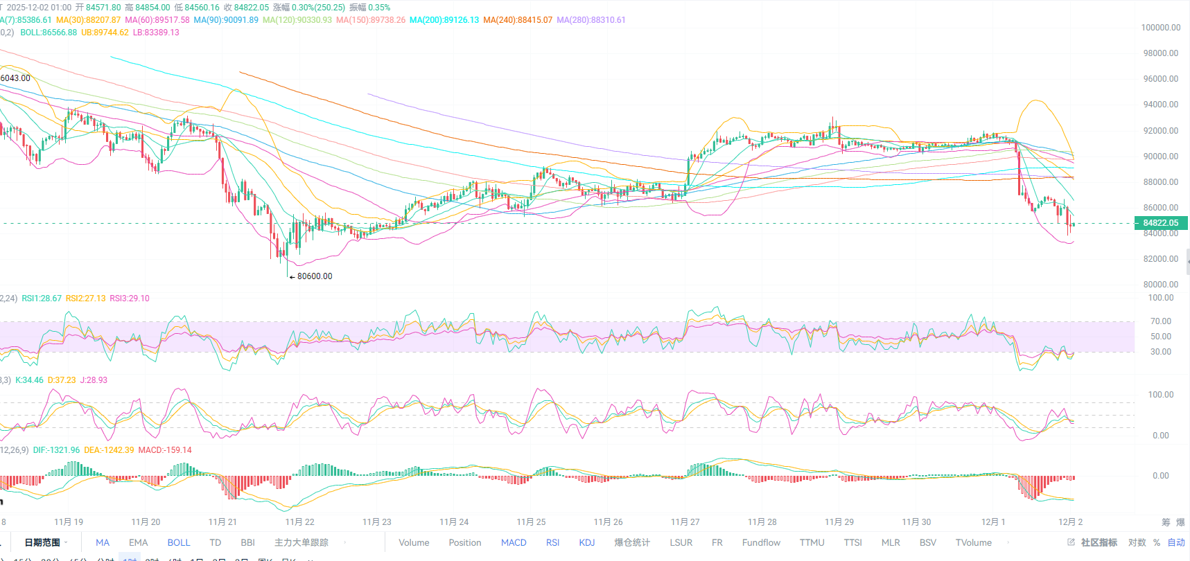 The current price of Bitcoin is around 84,700. Bitcoin has once again been affected by the U.S. stock market, dropping below 84,000 in the evening. Currently, the K-line is rebounding in the lower range of the 1H channel. The RSI three lines are rising close to 30, while the KDJ three lines are rebounding weakly below 50 and heading down again, with the bearish trend still dominating at low levels. The BOLL three lines continue to move downward without convergence, and the upper key middle track and MA7 range pressure can continue to connect with the bears.