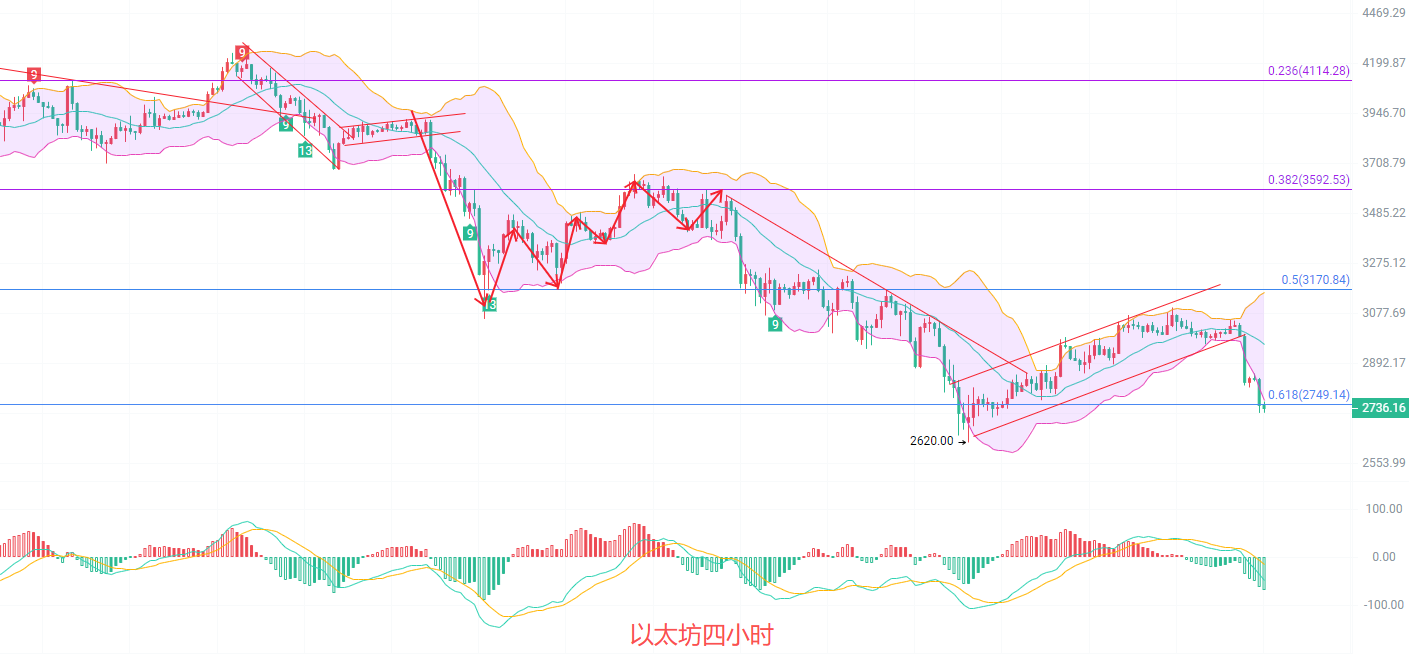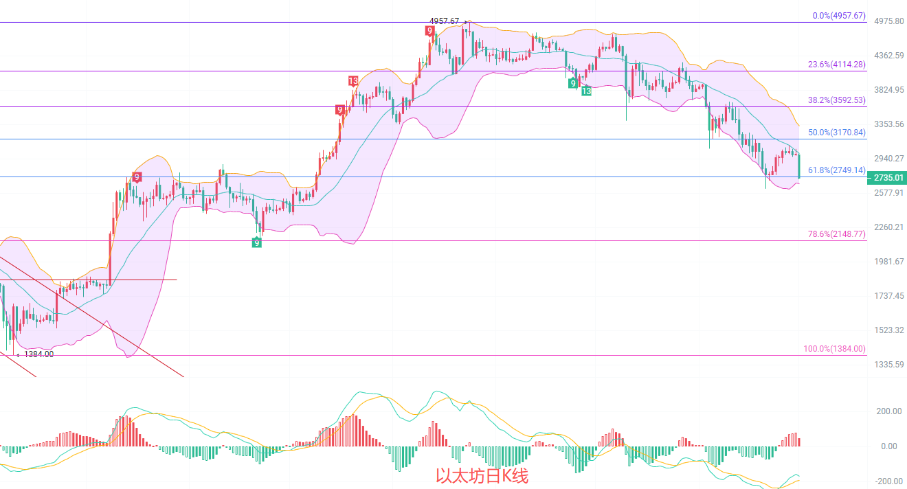 Before the article was published, the daily K-line reached a maximum of 3000 and a minimum of 2718. The EMA continues to show a bearish trend, with EMA15 at 2995. The K-line has reached the golden ratio line of 0.618, hovering around 2749. The MACD volume has decreased, with DIF and DEA contracting downwards below the 0 axis. The K-line dropped sharply from the Bollinger Band middle line of 3000 to the lower Bollinger Band near 2676. The KDJ is forming a death cross as it moves downwards, and the bearish trend is established. Currently, there is no sign of a demand for a pullback.