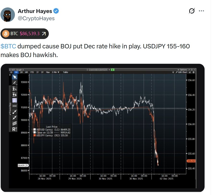 Arthur Hayes, founder of BitMex, pointed out that Bitcoin's recent decline is closely related to the Bank of Japan's potential interest rate hike in December. As the USD/JPY exchange rate rises to the 155–160 range, the Bank of Japan is forced to adopt a more hawkish stance, which directly tightens global liquidity and puts short-term pressure on Bitcoin.