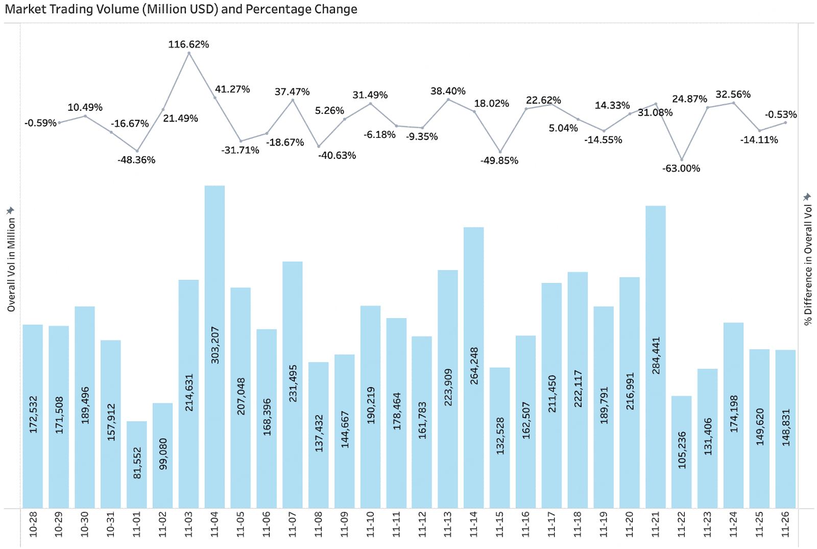According to CoinGecko data, as of November 26, the overall trading volume in the crypto market showed significant fluctuations, with an average daily trading volume of approximately $180.8 billion. Overall, at the beginning of November, there was a rapid rebound in trading volume after a brief pullback, maintaining high levels of oscillation in the middle of the month with frequent inflows and outflows of funds. Although there were again local peaks in trading volume in the latter part of the month, they failed to form sustained momentum, and trading volume subsequently declined significantly, indicating that funds preferred short-term speculation rather than establishing trend-based positions.