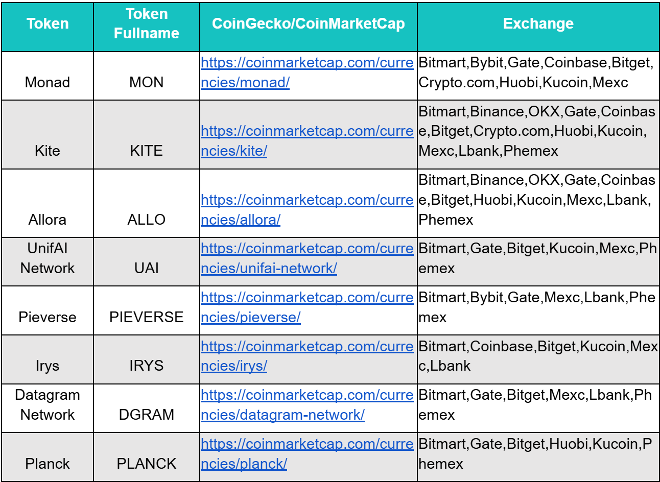 The newly launched popular tokens in November were still primarily VC-backed projects, with low activity in meme tokens. Among them, Monad, Pieverse, and Allora performed prominently, with active trading following their launch.