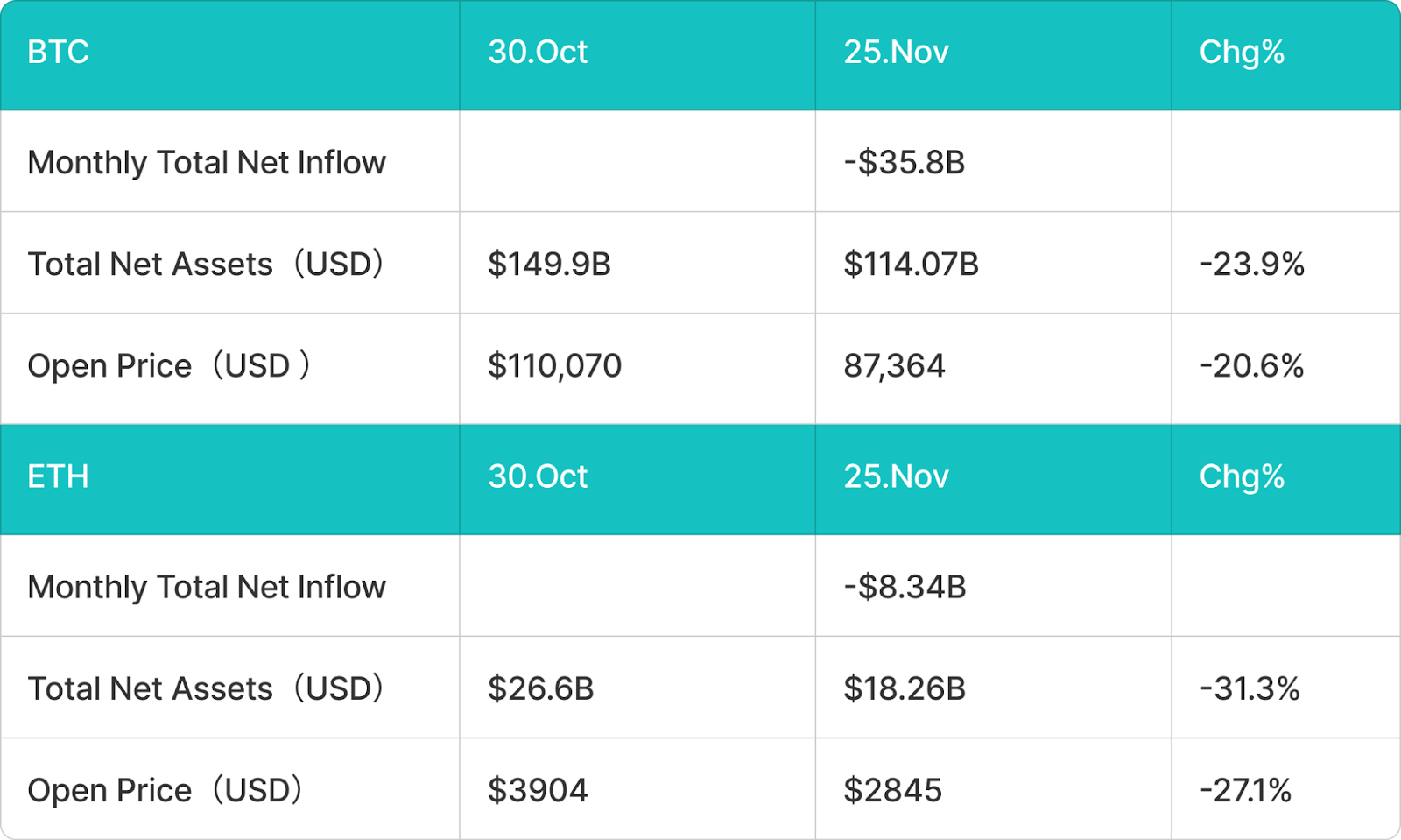 This month, the BTC spot ETF experienced significant outflows, with a net outflow of $35.8 billion for the month, a decrease of 23.9% compared to the previous month. This trend was mainly influenced by the decline in BTC prices, which fell by 20.6% during the month, leading to redemption pressure and a simultaneous shrinkage in the total asset value of the ETF. Since the black swan event on October 11, the overall rebound of crypto assets has been weak, with insufficient price recovery for BTC and other tokens, and market sentiment has remained low, further exacerbating the outflow of funds.