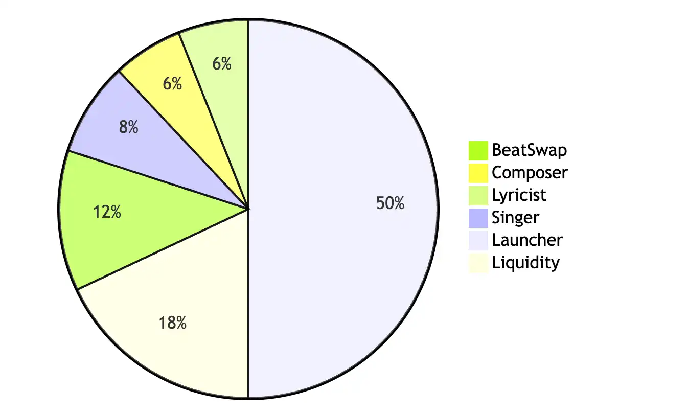 BeatSwap standardizes each IP work into 2,000 RWA IP tokens, representing the neighboring rights of that work. Half of these are sold to the public through RWA Launcher for work financing and market exposure; 18% is injected into the protocol by BeatSwap to provide liquidity for initial trading. Among the creator community, composers, lyricists, and singers hold 6%, 6%, and 8% of the RWA tokens, respectively, with the option to hold long-term to share in the growth of the work or trade freely in the market. The remaining 12% is used by BeatSwap for exclusive copyright management and does not enter the public market.