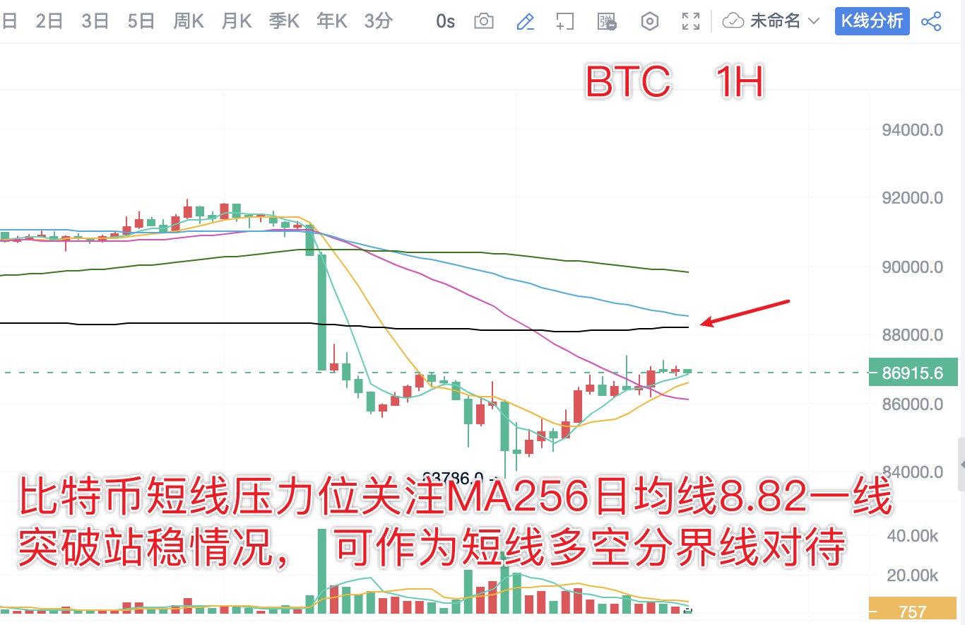 From the daily chart of Bitcoin, it once again tested the low point of 8.37 yesterday and is currently rebounding after hitting the bottom. The upper resistance level to watch is the MA256 daily moving average at 8.82 on the hourly chart. This level can be treated as a watershed for long and short positions. The daily resistance level focuses on the MA5/10 daily moving average at 8.9. Currently, the 4-hour chart has continuously closed with red candlesticks, so pay attention to the suppression situation at the MA60 daily moving average at 8.85.