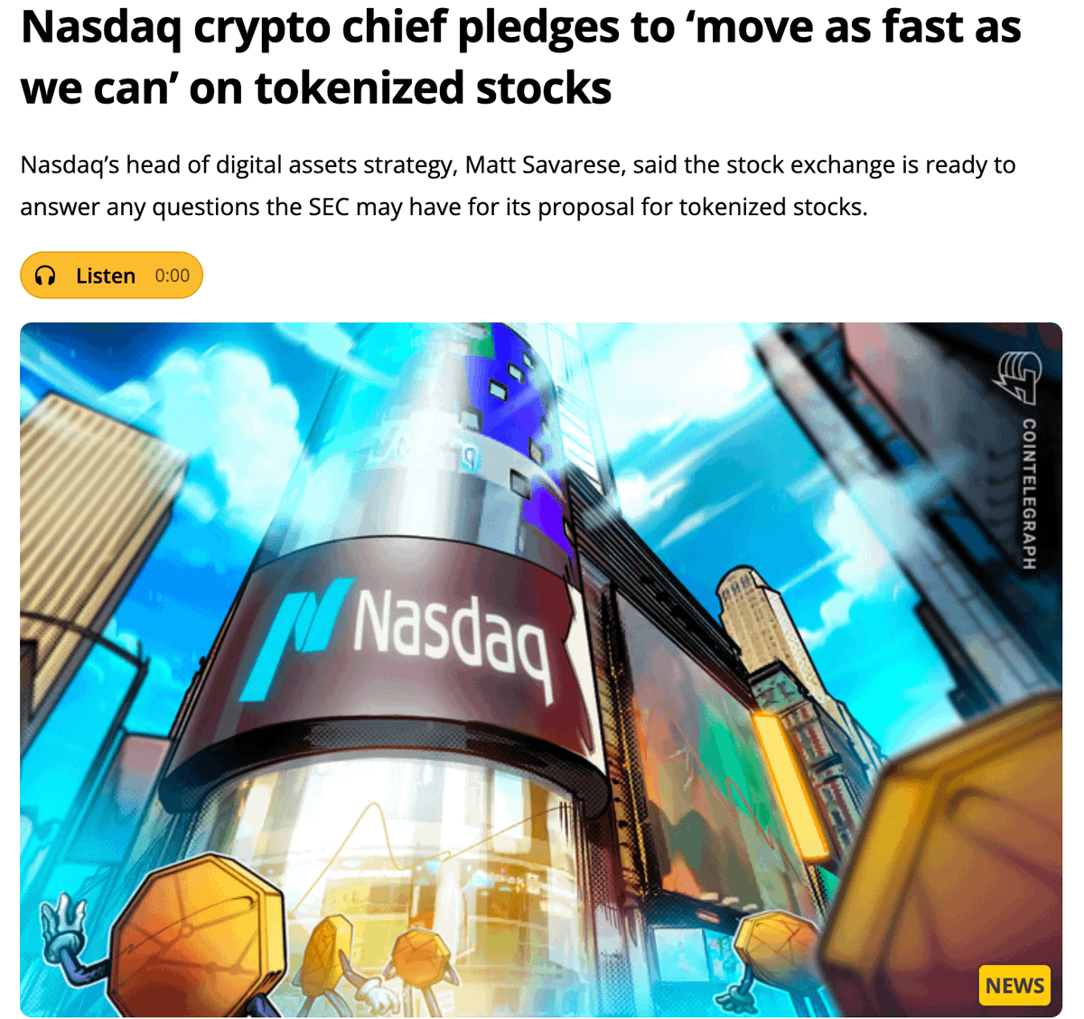 A few days ago, a piece of news refocused the market on #RWA US stock tokenization. A Nasdaq executive claimed, "We are fully advancing the tokenization of stocks, and SEC approval has been prioritized." US stock tokenization should be regarded as the greatest innovation in #Web3 since the DEFI Summer of 2020, without exception. With the recent CRS tax investigation wave on small US stock accounts (ranging from $100,000 to $500,000) in the domestic market, as well as tightening policies for opening US stock accounts, the #RWA method of US stock tokenization will likely become the preferred choice for most people investing in US stocks in the future!