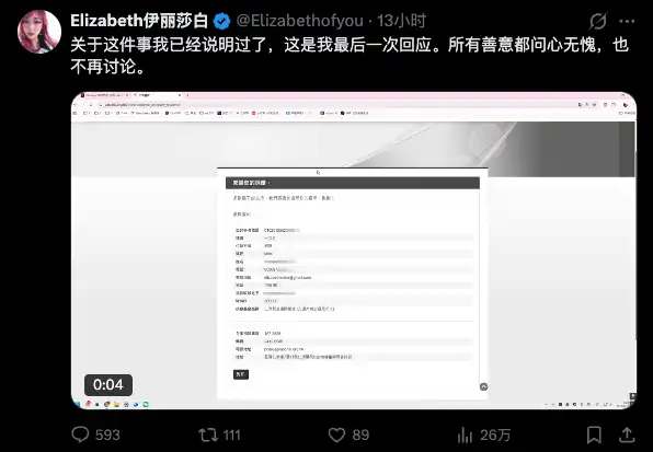 In the face of overwhelming skepticism, Elizabeth released a video response on the evening of the 1st. In the video, she insisted that she "has donated and feels no guilt," stating that this would be her last response, and then displayed another screenshot.