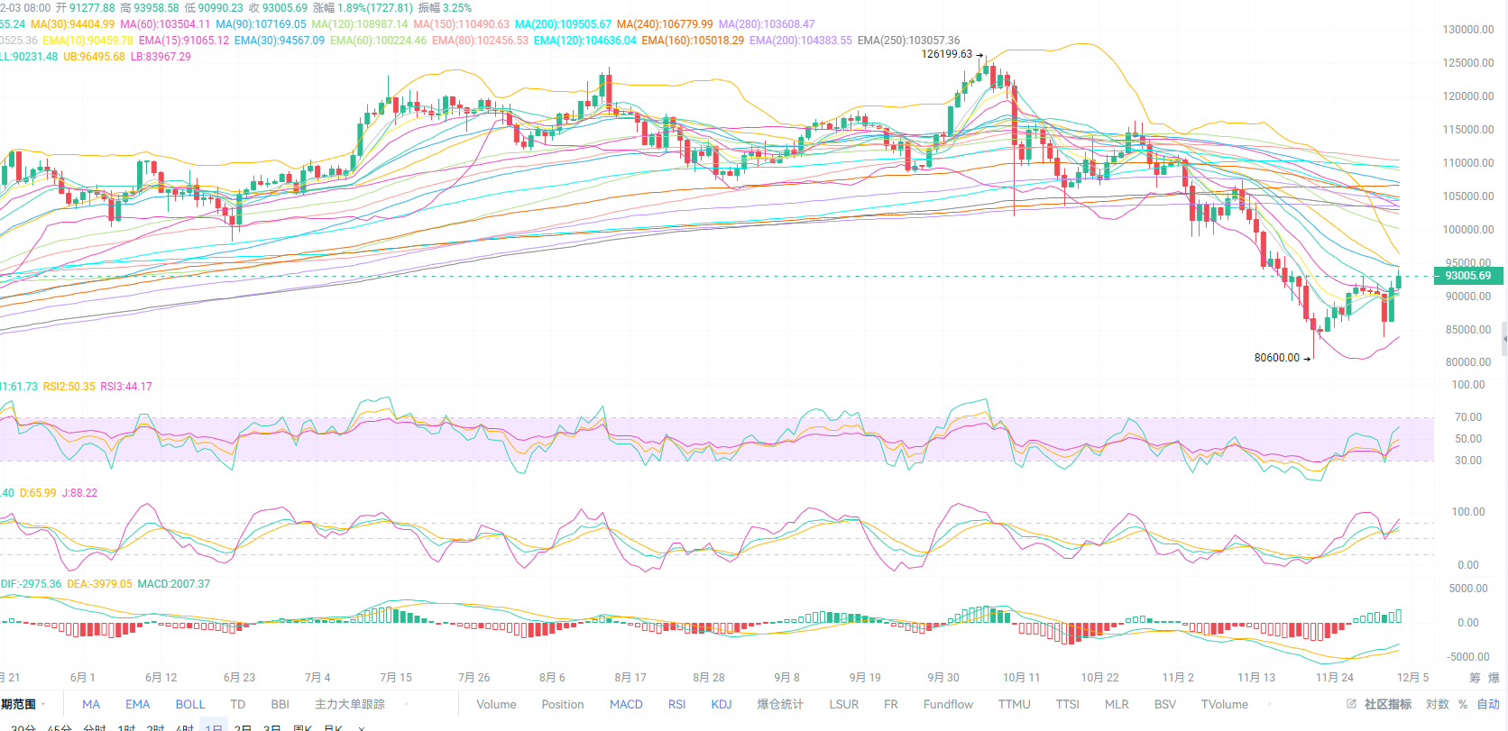 The current price of Bitcoin is around 93,000. In the 1H evening market, Bitcoin has attempted to break below the MA30 line three times without success, indicating that the bulls are still relatively strong. The short position set by Red Sister today has only 1,500 points of space, and the market has returned above the middle track again. The MACD's red bars are shrinking again, and after the DIF and DEA formed a dead cross, they are converging. The RSI's three lines are sticking together and rising close to 65, while the KDJ's three lines are moving up close to the overbought zone. The RSI's three lines are crossing upwards close to 70, indicating that there is a possibility for the market to continue to attack and break through the previous high at the upper track. Red Sister suggests that the high short position needs to continue to move up, and the short-term support still focuses on the MA30 and the lower track area for buying.