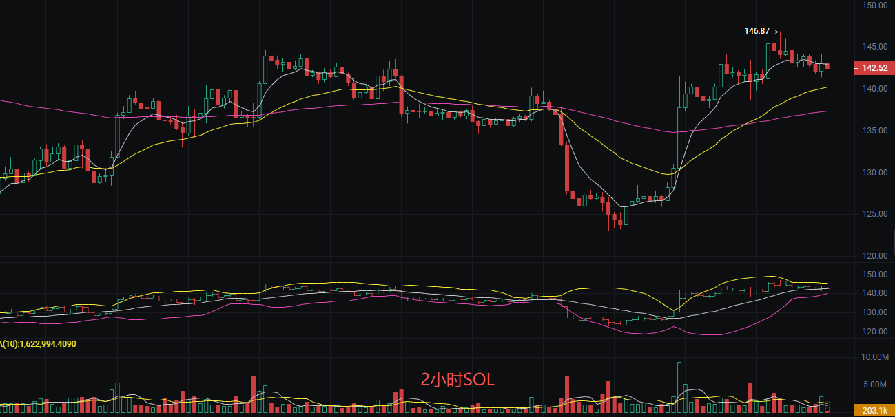 The current price of Solana is 142.5. The analysis suggests that Solana (SOL) is currently in a range-bound pattern, fluctuating between strong support at 129.3 and strong resistance at 146.8. The momentum indicators are trending flat, the moving average system is entangled, and although the candlestick pattern shows a bullish engulfing, indicating a potential short-term rebound, the death cross in the moving average system and weakening momentum create some conflict. Overall, the trend still leans towards sideways consolidation.
