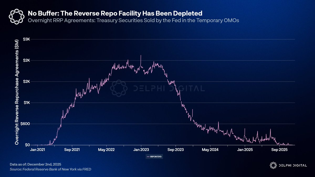 Any future Treasury issuance or TGA rebuild has to come directly out of bank reserves. The Fed is left with two options: let reserves drift lower and risk another repo spike or expand the balance sheet to provide liquidity directly.