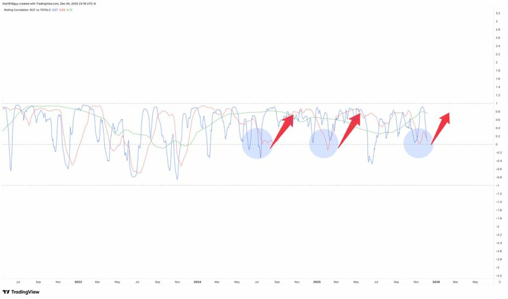 The annual correlation between Total 3 and the Russell 2000 has held around 0.75 since early 2024, meaning both markets are responding to the same underlying liquidity and risk appetite forces.