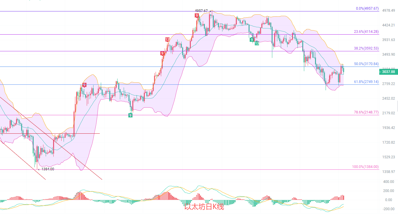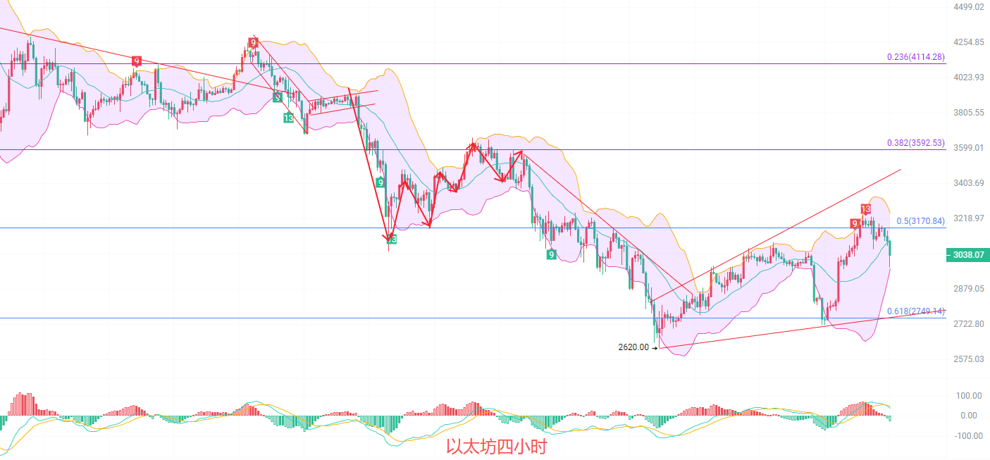 The four-hour K-line is currently encountering significant support at the 3000 mark. The EMA trend indicator is also forming strong support at this level. The focus can be placed on the 3000 mark. The MACD is decreasing in volume, and the DIF and DEA are forming a death cross at high levels, indicating a dominant downward trend. The lower Bollinger Band support at 2972 is effective, so this can be used as a reference. If it breaks below, it will continue to move south. If it holds this support, there can also be an attempt to go long. For cautious investors, the entry point for going long can still be set at 2750.