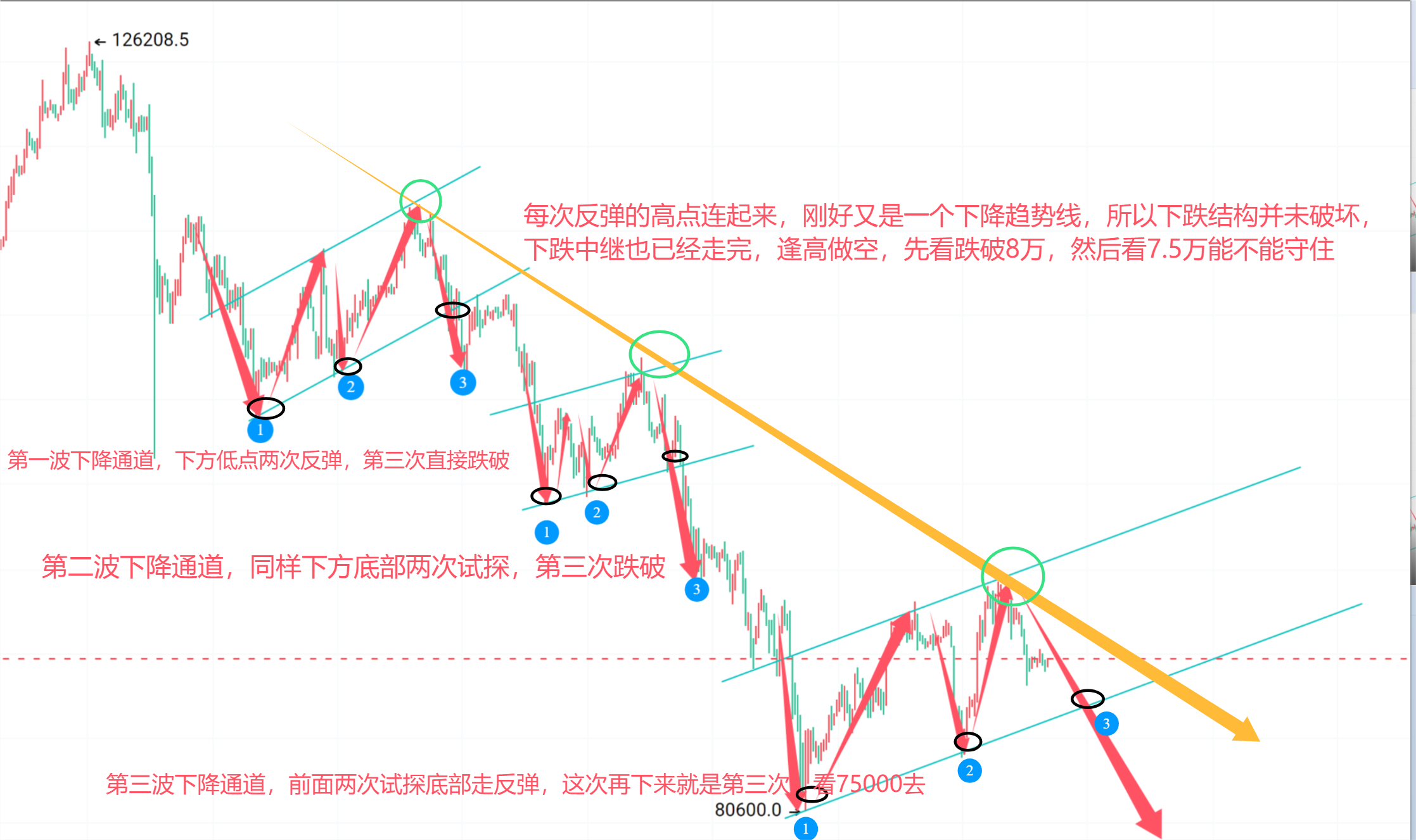 As shown in the figure, Bitcoin has been in a downward process since peaking at 126200. It is currently in the third descending channel. The first one started from 103470, which is the bottom, and the highest rebound reached 116380, which is the top, forming a descending trend channel. After testing the lower bottom twice, it broke down on the third attempt, breaking the descending trend channel and entering the next price channel. The second price channel has a bottom at 98888, which received support, and the highest rebound reached around 107470, also testing the lower bottom twice before completely breaking down on the third attempt, opening up downward space. Currently, the third price channel is being formed, with a bottom at 80600 receiving support for a rebound. The highest rebound has reached around 94100, and it is now undergoing a pullback. The lower bottom has also been tested twice. According to the patterns of the previous two waves, this wave should break below this bottom line to reach a new low, a lower position.