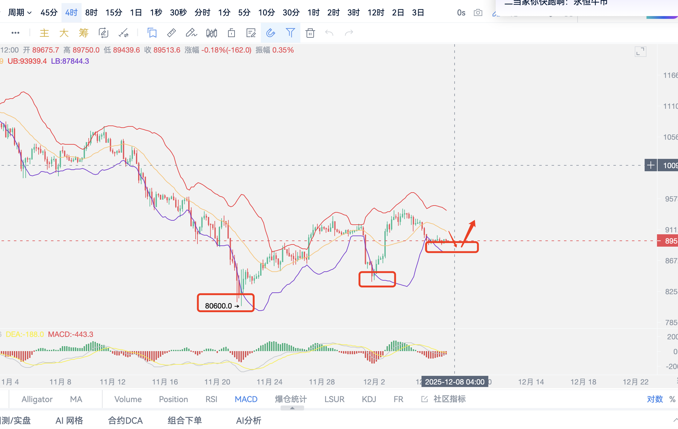 Currently, the four-hour price is running in the middle to lower range. As long as the bottom of the K-line does not break, the price is bound to rebound. It should find direction during the evening session of the US market. After the drop on Friday and the closing pin bar, it has remained stable. As long as the price stays above 88,000, an increase is just a matter of time. The MACD indicator in the attached chart is gradually showing a decrease in bearish momentum, so I am optimistic about the market's upward trend.