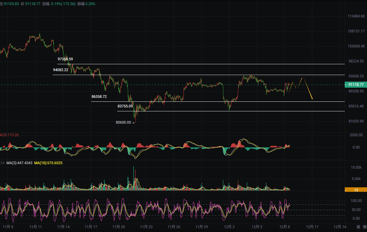 At 3 AM this Thursday, the Federal Reserve will announce the interest rate decision for December, with the market generally expecting a rate cut. This is the core logic behind the bullish outlook on coin prices. However, Yanling believes that the benefits of a rate cut have already been priced in—since the probability of a rate cut has risen from 30% to 80%, the subsequent uplifting effect will be limited. Therefore, I have maintained a conservative stance on the rise in coin prices. Since the price rebounded from around 80600, most opinions have been firmly bullish, but Yanling has always believed this is just a rebound rather than a significant increase. Even if the rate decision raises prices this time, it is likely to be a trap for bulls rather than a one-sided upward trend, and the qualitative assessment of maintaining a high range of fluctuations in coin prices in the fourth quarter remains unchanged.