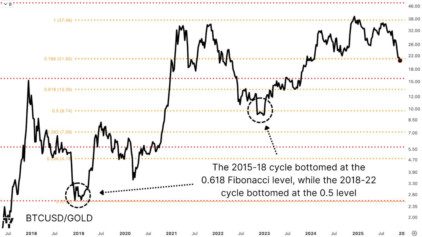 In the 2015-2018 cycle, the bear market bottom occurred at the 0.618 Fibonacci level, corresponding to approximately 2.56 ounces of gold per Bitcoin; the bottom of the 2018-2022 cycle precisely landed at the 0.5 level, corresponding to about 9.74 ounces of gold per Bitcoin. The latter became an important resistance-turned-support level in the subsequent bull market.