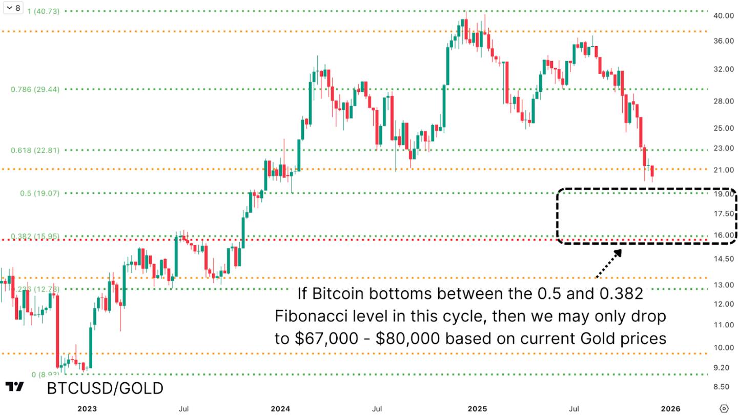 Measured against assets like gold, Bitcoin's purchasing power has been continuously declining since December 2024, with the bear market duration far exceeding what simple dollar-based analysis suggests. When converted to dollars, the cross-cycle Fibonacci retracement levels indicate strong support in the $67,000-$80,000 range. Although the analysis is theoretical and actual movements may not align perfectly, the data overlaps across multiple time dimensions and valuation frameworks suggest that the end of the bear market may arrive sooner than the market expects.