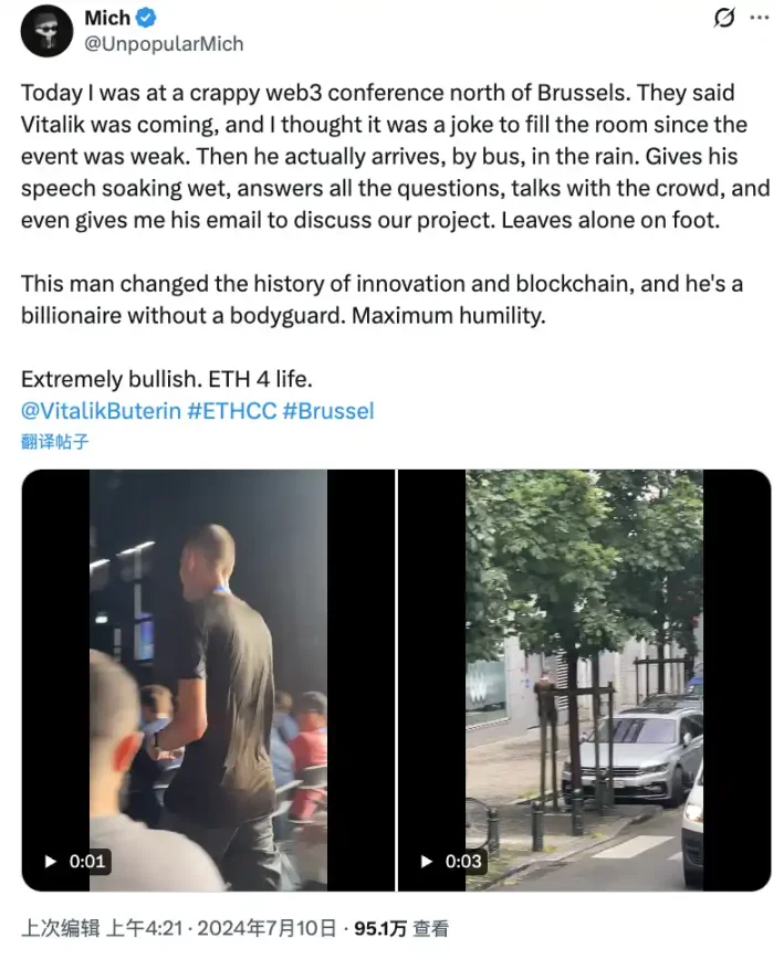 Yet, it seems that most of the time, people do not see Vitalik with bodyguards. For example, at the ETHCC conference in Brussels in July 2024, Vitalik arrived alone by bus in the rain, his clothes still wet during his speech, and left on foot afterward, without any bodyguards accompanying him.