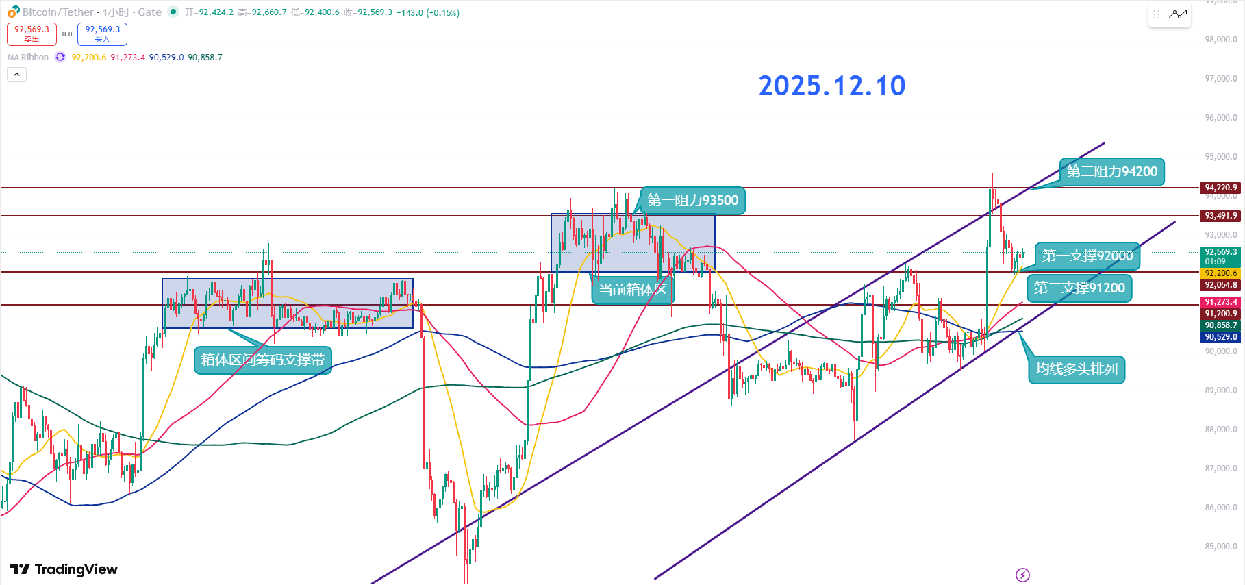 The price is currently consolidating in the range of 92K to 93.5K, with the lower range of 90.4K to 91.8K being the previous large support and trading dense area. The last rebound was too strong, so the pullback is naturally not light; this is a healthy trend.