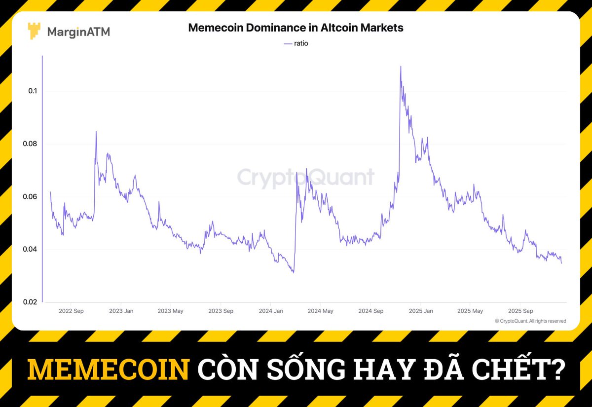 Theo data từ @cryptoquant_com , tỷ lệ thống trị của memecoin trong altcoin market đang rơi về đáy mới, thấp hơn cả giai đoạn đầu 2023 và cuối 2024.